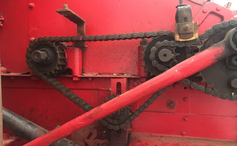 This week we started to check over the combine so it is ready to go if we get the opportunity. The triangular shaped double chain in picture one was rather floppy and had run out of adjustment, so Tony and I removed it and shortened by a link and rejoined it. It is now just the right tension! There are several others to adjust and shorten too…..!