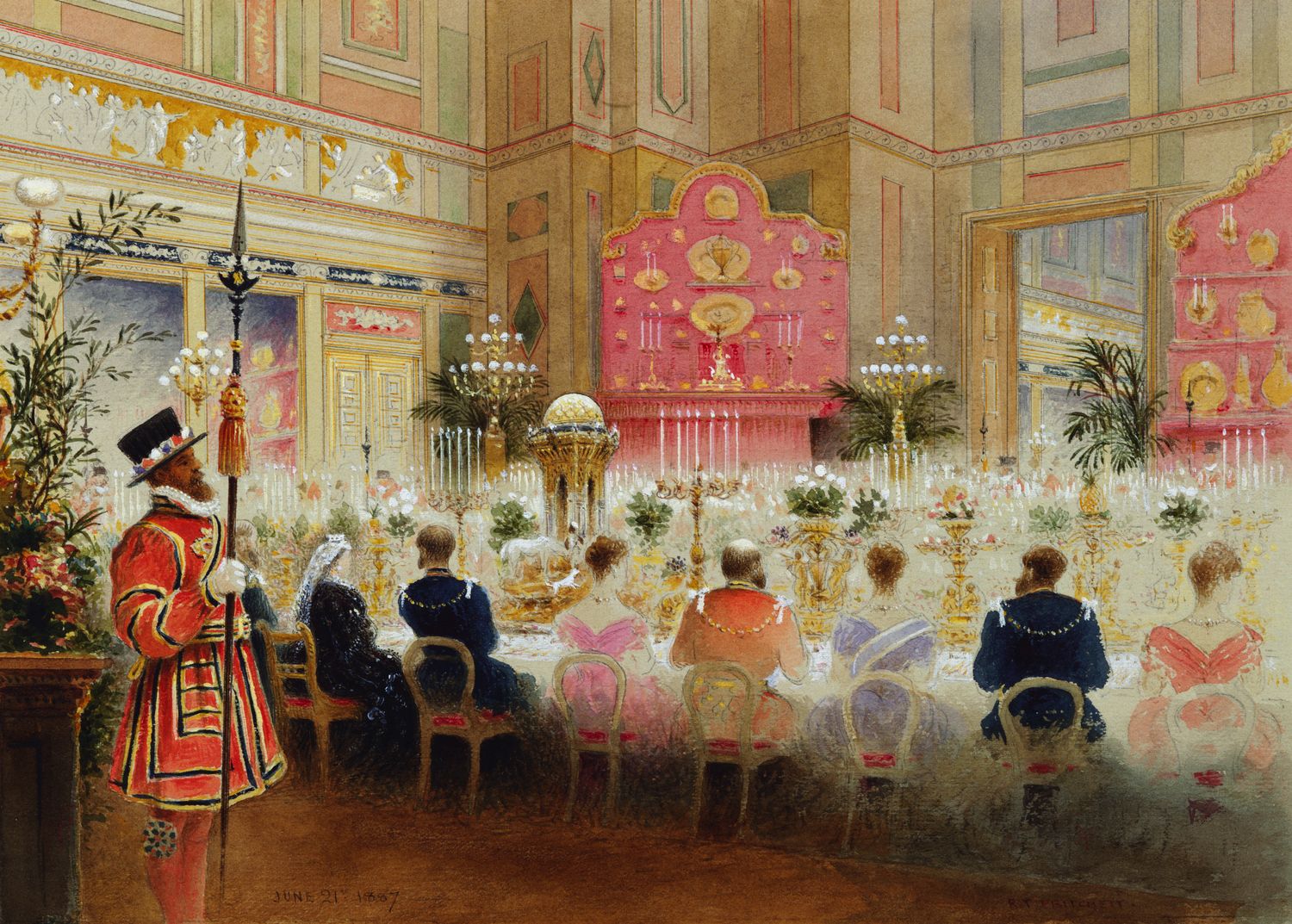 Queen Victoria’s reign commenced on 20th June 1837, she would reign for over 63 years. On the 20th June 1887 Queen Victoria breakfasted at Frogmore, close to Prince Albert’s Mausoleum, before sitting down to a gold plate banquet at Buckingham palace with fifty foreign royals and the governing heads of Britain’s overseas colonies and dominions. The following day the sovereign attended a service of Thanksgiving at Westminster before returning to Buckingham Palace through the cheering crowds, the day closed with fireworks.